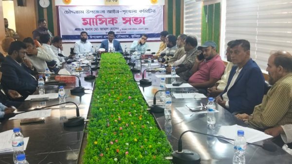 কুমিল্লার চৌদ্দগ্রাম উপজেলা প্রশাসনের আইনশৃঙ্খলা কমিটির মাসিক সভা বৃহস্পতিবার (২৭ নভেম্বর) উপজেলা মিলনায়তনে অনুষ্ঠিত হয়েছে। এতে সভাপতিত্ব করেন উপজেলা নির্বাহী কর্মকর্তা মো. জামাল হোসেন। সভায় বিভিন্ন বিষয়ে বক্তব্য রাখেন উপজেলা