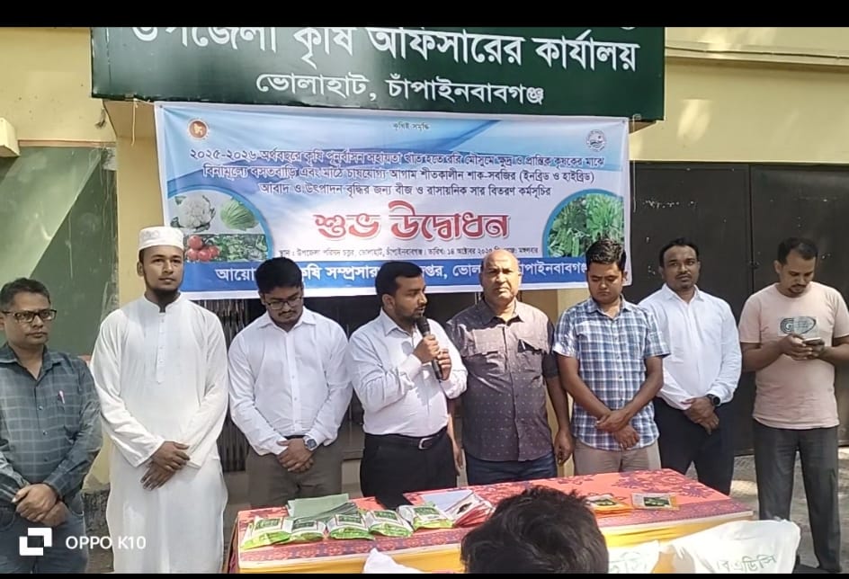 চাঁপাইনবাবগঞ্জের ভোলাহাট উপজেলায় ২০২৫-২৬ অর্থ বছরে রবি মৌসুমে ক্ষুদ্র ও প্রান্তিক কৃষকদের মাঝে বিনামূল্যে বীজ ও সার বিতরণের প্রণোদনা কর্মসূচির উদ্বোধন করা হয়েছে।