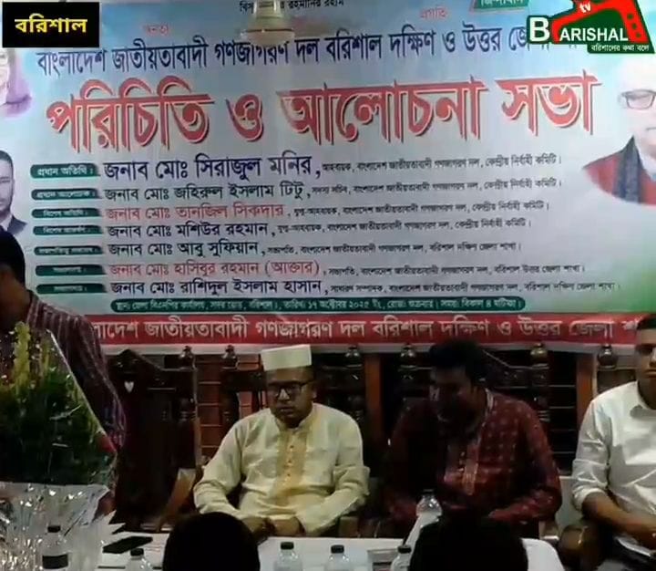 বাংলাদেশ জাতীয়তাবাদী গণজাগরণ দল বরিশাল দক্ষিণ ও উত্তর জেলা শাখার নবগঠিত কমিটির পরিচিতি ও আলোচনা সভা গত ১৭ই অক্টোবর বরিশাল জেলা বিএনপির কার্যালয়ে অনুষ্ঠিত হয়। জাতীয়তাবাদী গণজাগরণ দলের বরিশাল দক্ষিণ জেলা শাখার সভাপতি আবু সুফিয়ান এর সভাপতিত্বে এবং বরিশাল উত্তর জেলা কমিটি সভাপতি হাসিবুর রহমান এবং দক্ষিণ জেলা কমিটির সাধারণ সম্পাদক রাশেদুল হাসান এর যৌথ সঞ্চালনায় অনুষ্ঠিত উক্ত আলোচনা সভায় প্রধান অতিথি হিসেবে উপস্থিত ছিলেন বাংলাদেশ জাতীয়তাবাদী গণজাগরণ দল এর নির্বাহী কমিটির আহ্বায়ক মোহাম্মদ সিরাজুল মনির বিশেষ অতিথি হিসেবে উপস্থিত ছিলেন কেন্দ্রীয় নির্বাহী কমিটির যুগ্ম আহ্বায়ক মশিউর রহমান। এতে বক্তব্য রাখেন জাতীয়তাবাদী গণজাগরণ দলের বরিশাল উত্তর জেলা দক্ষিণ জেলা ও উপজেলা কমিটির সমূহের নেতৃবৃন্দ।